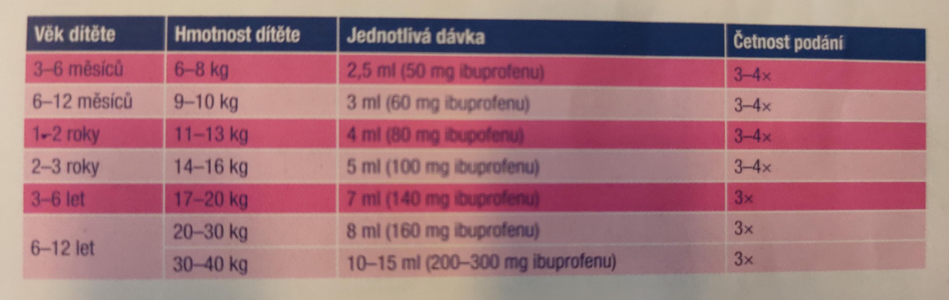 - při teplotě nad 38 st C srážíme teplotu paracetamolem nebo ibuprofenem v dávce 10 mg na kg váhy dítěte. Nikdy u dětí nepoužíváme přípravky s kyselinou acetylsalicylovou (Aspirin)! U kojenců a malých batolat přednostně podáváme léky formou čípků do konečníku, u předškolních a malých školních dětí v sirupu, u starších dětí v tabletách. Půl hodiny po podání teplotu přeměříme. Je-li alespoň o 0,5 st C nižší než původní (tedy např. místo 38,5 je 38 st), pak lék zabral a dítě necháme v klidu ležet, opakujeme měření po 2 h, v př. zhoršení stavu dítěte i dříve. Další lék stejného typu můžeme podat nejdříve za 6 hodin (tedy např. po paracetamolu za 6 h opět paracetamol). Stoupá-li však teplota nad 38 st C dříve než za 6 h, je vhodné střídat léky s různou účinnou látkou po 4 h (např. ve 12,00 h podám paracetamol, v 16,00 h ibuprofen, ve 20,00 h paracetamol, o půlnoci ibuprofen,..atd). Teplota však stále stoupá přes 38 dříve než za 4 h nebo lék nezabral = nesnížil po ½ h teplotu alespoň o 0,5 st C? Je na místě začít se sprchováním nebo omýváním malého dítěte houbou ve vaničce s vlažnou vodou. Děti toto snáší lépe než zábaly, ale i ty je možno dělat, jen je nepřikrývat peřinami. Při sprchování nepoužíváme proud ledové vody a nikoliv rovnou na hrudník, ale začínáme sprchovat vlažnou vodou od dolních končetin směrem k horní části hrudníku pomalu, postupně. Stejným způsobem omýváme malé dítě houbičkou ve vlažné vodě ve vaničce. Jakmile má dítě husí kůži nebo cítí velkou nevůli, proceduru ukončíme a opět přeměříme. Klesla-li teplota alespoň o 0,5 st C, dítě osušíme a uložíme v klidu do postele. Pokud ne, dítě osušíme, necháme odpočinout a proceduru několikrát do hodiny opakujeme.